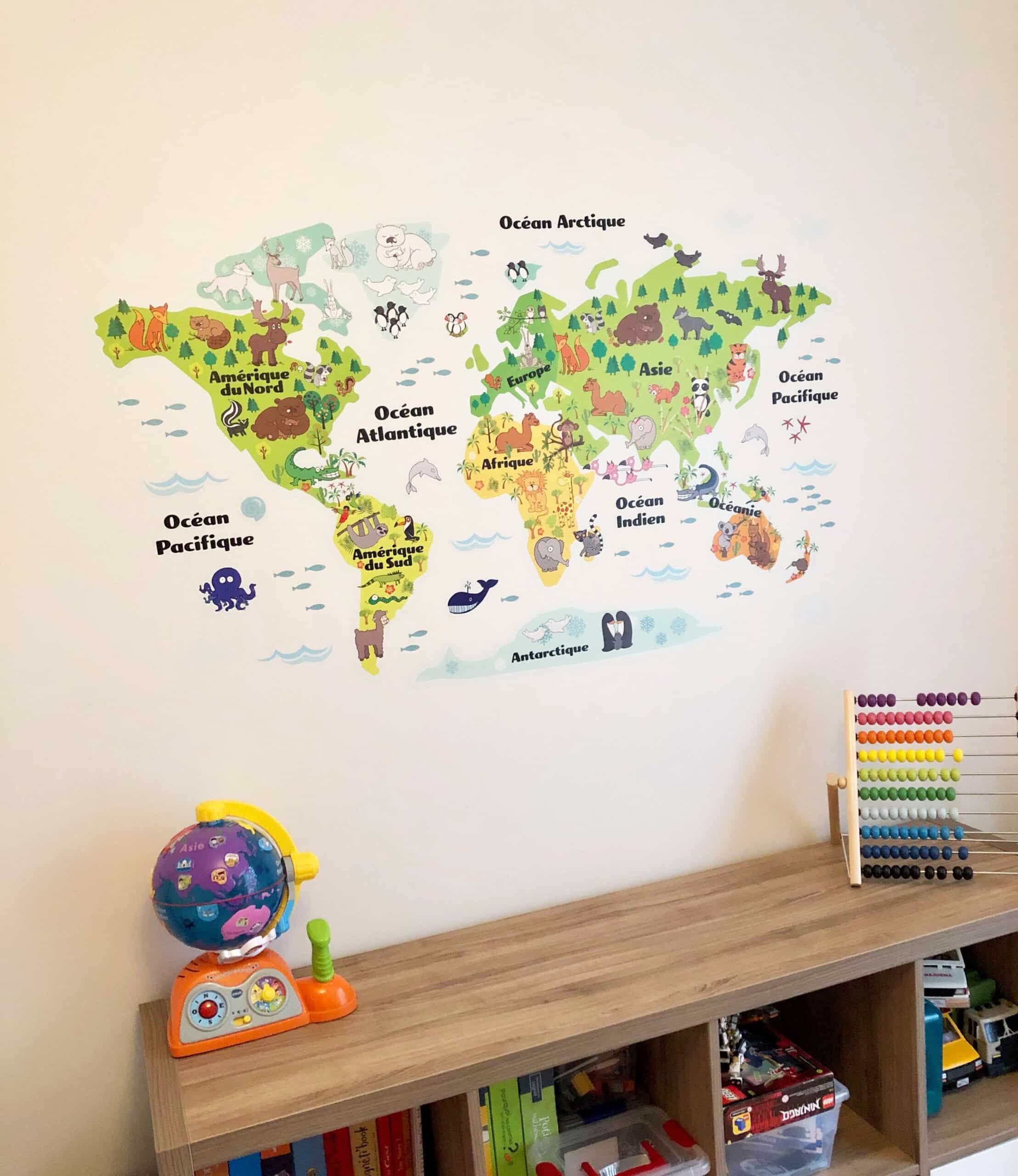 Carte du monde illustrée sur le thème des animaux, en français, anglais ou espagnol aux couleurs vives