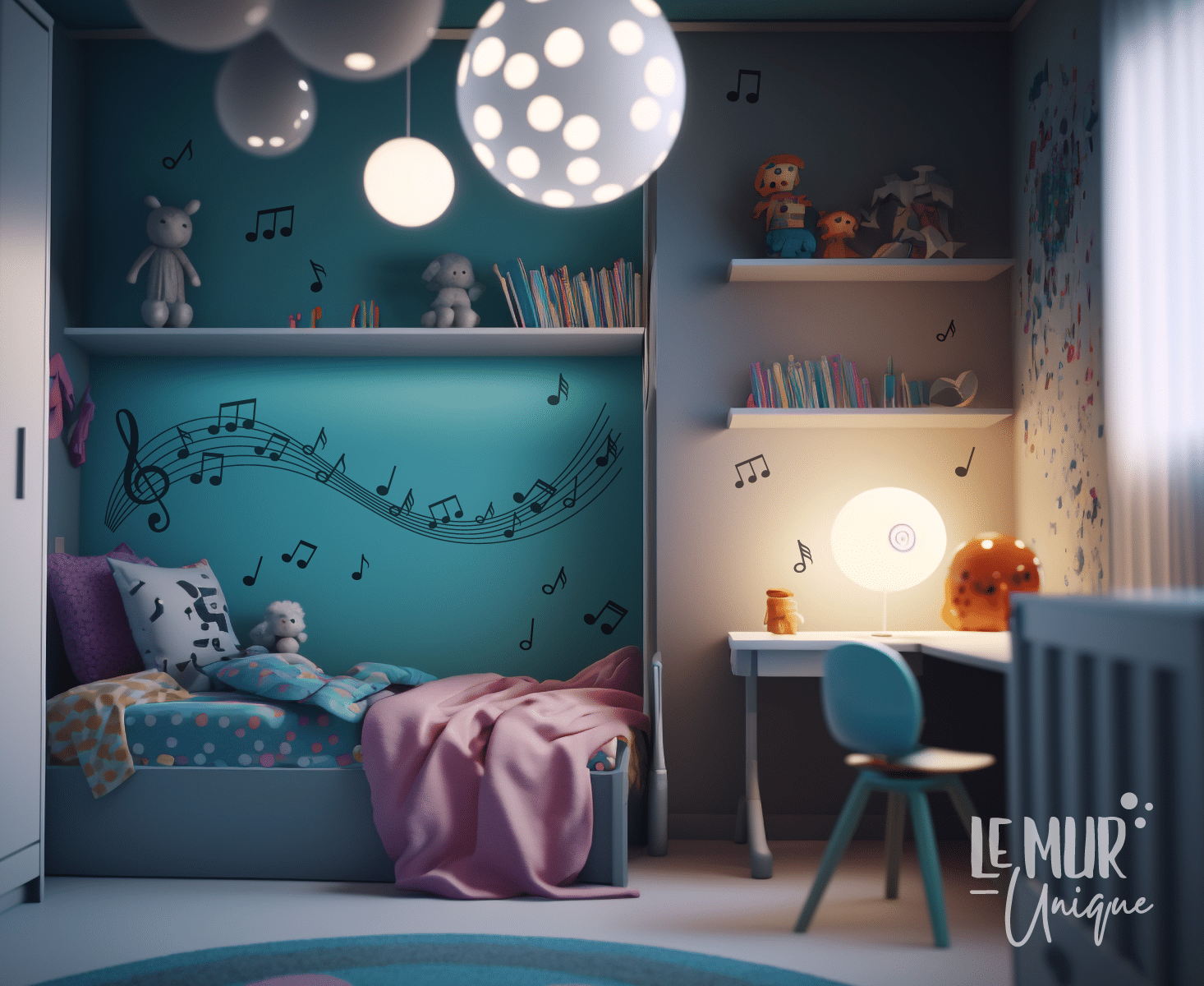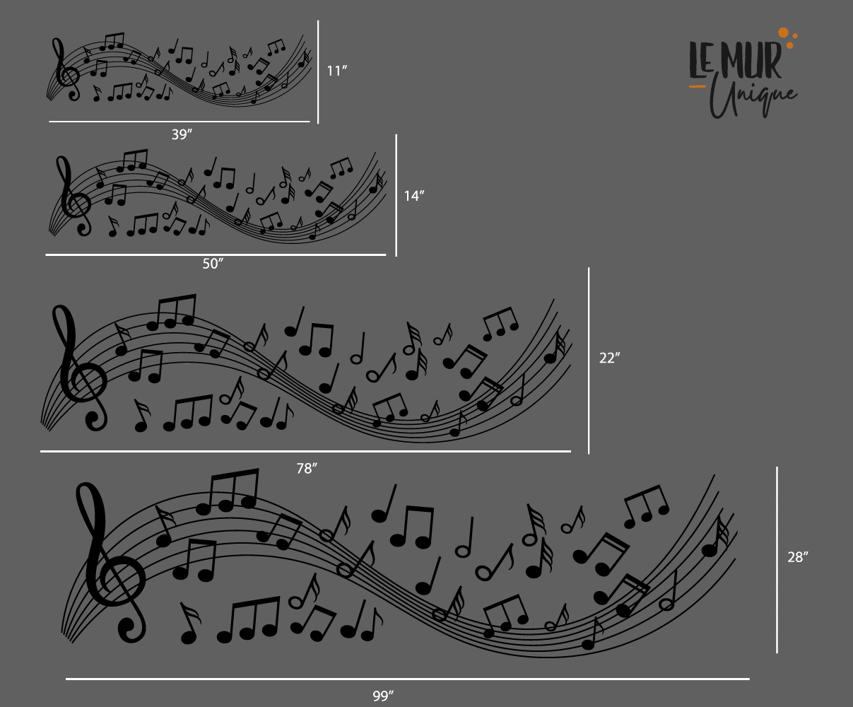 L’ensemble comprends une portée avec clé de sol et notes de musique intégrés ainsi que plusieurs notes de musique individuelles à placer à votre guise pour laissez créez votre mur au design unique!