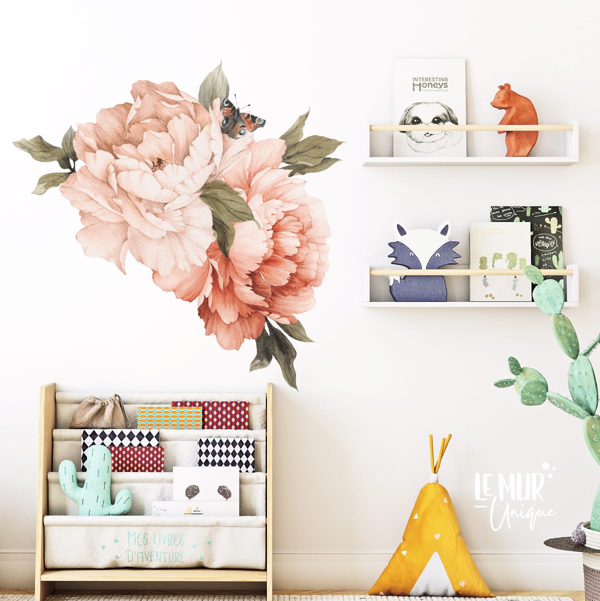 Gros autocollant mural (50 » x 33 ») d’un magnifique duo de pivoines de couleur corail chaud ou vieux rose doux avec un papillon.