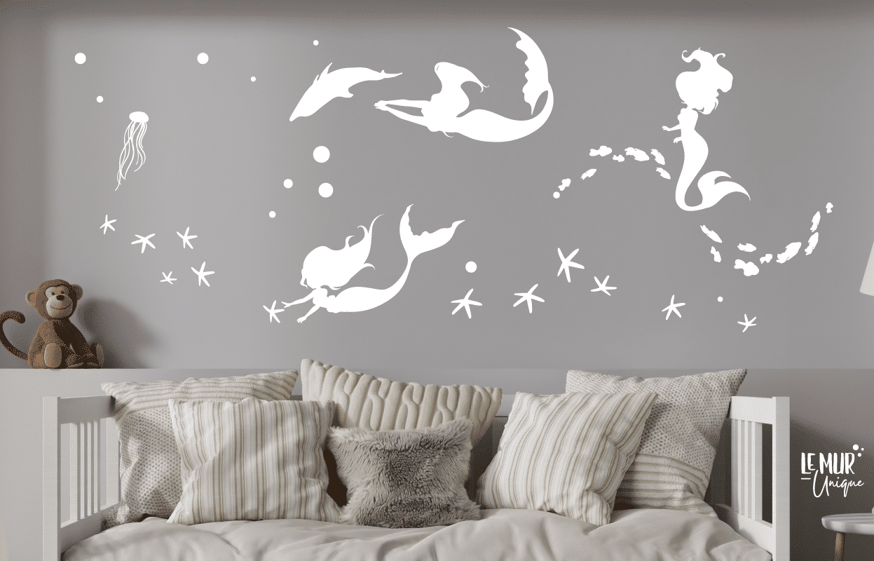 Les décalques autocollants muraux de sirènes, bulles, petits poissons et méduses sont parfaits pour une salle de jeux, un local de garderie, une chambre de bébé ou d’enfant!
